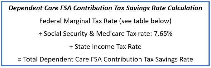 Money that you set aside in a flexible spending account for dependent care expenses is a great tax saver because it not only reduces your taxable income, but also avoids the 7.65% Social Security and Medicare tax. So, if you are in the 22% marginal tax bracket, and you put the 2021 maximum contribution amount of $10,500 into the dependent care FSA, you can save up to $3,113 (29.65% x $10,500) in taxes. If you are in a state with an income tax you can tack on your state’s income tax rate % to your total savings rate.